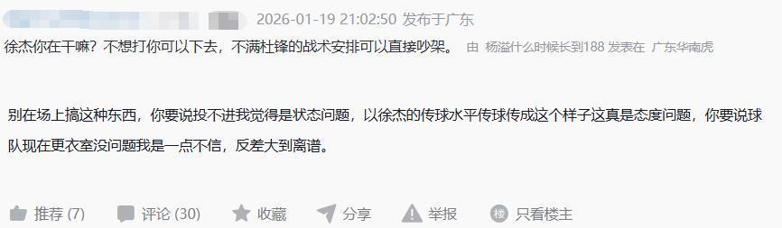 赛后,不少广东球迷对于徐杰也发表了不同看法,支持徐杰的球迷继续为他加油鼓劲,并且还有一些球迷指出了徐杰好像身体又出现了不适症状,第二节最后阶段左脚踝疑似出现了伤情(这应该是徐杰下半场打的差原因之一);